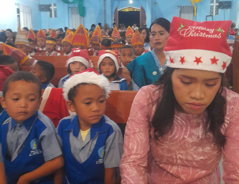 Para siswa hadir didampingi orang tua, menciptakan suasana perayaan yang meriah, hangat, dan penuh kekeluargaan. Didampingi Guru dan panitia Natal yang berbalut kostum putih merah dibalut rompi berhas ulos batak, ditambah backdrop panggung sederhana berwarna hijau, namun terkesan cukup meriah dihiasi lampu dan pohon Natal, yang merupakan ciri khas Natal.